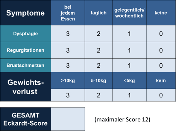 Der Eckardt-Score umfasst die Symptome Dysphagie, Regurgitation, retrosternale Schmerzen und Gewichtsverlust. Er wird zur Graduierung der Erkrankung und zur Beurteilung des Therapieerfolges herangezogen. Die Bewertung erfolgt durch Summation der Einzelwerte (0–12 Punkte). Ein Score von ≤ 3 gilt als Ausdruck einer suffizienten Symptomkontrolle. [1]