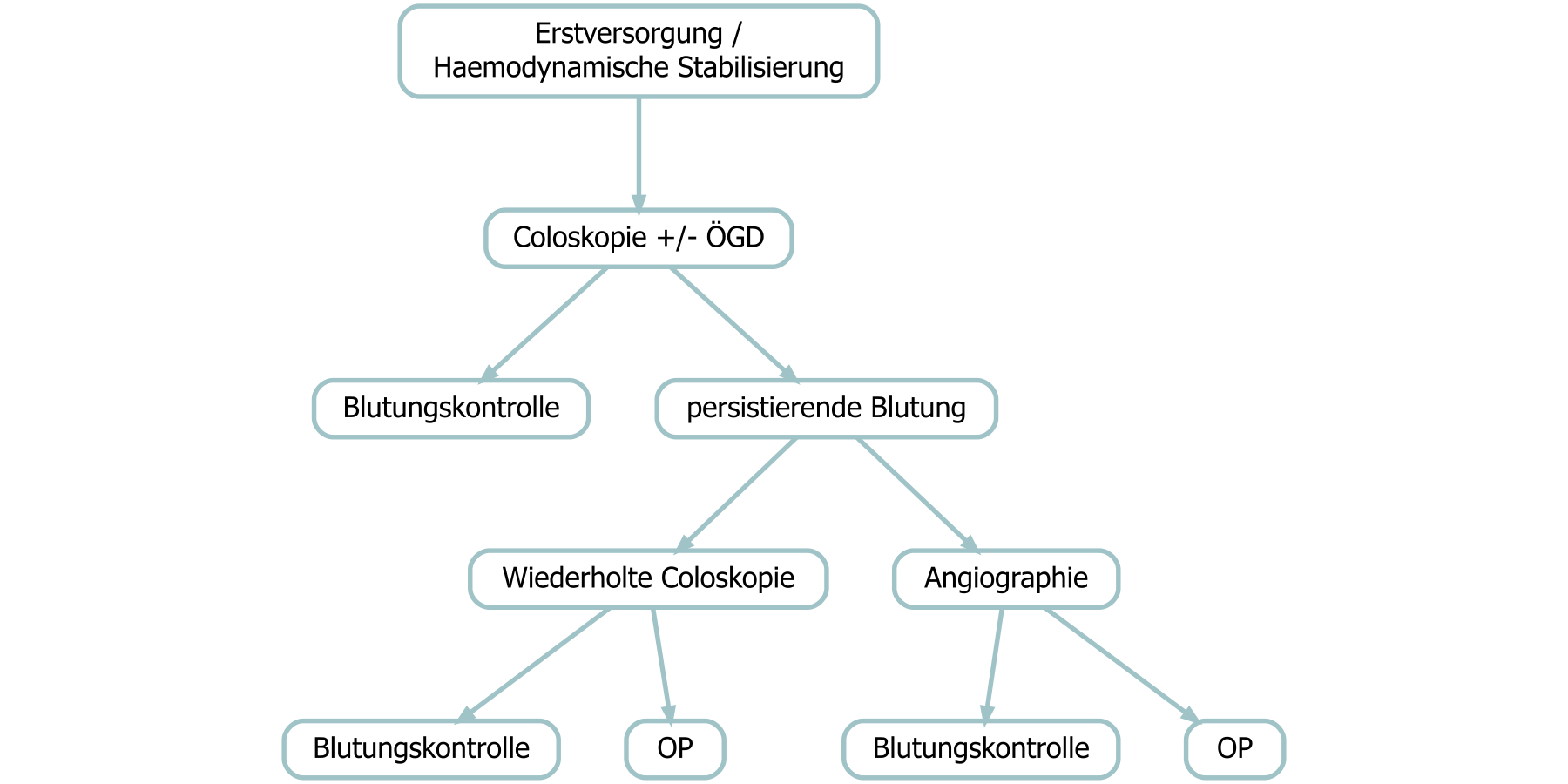 | I: persistierende Blutung, instabil, Hb-Abfall | Sofortige ÖGD + Colo ohne Vorbereitung |